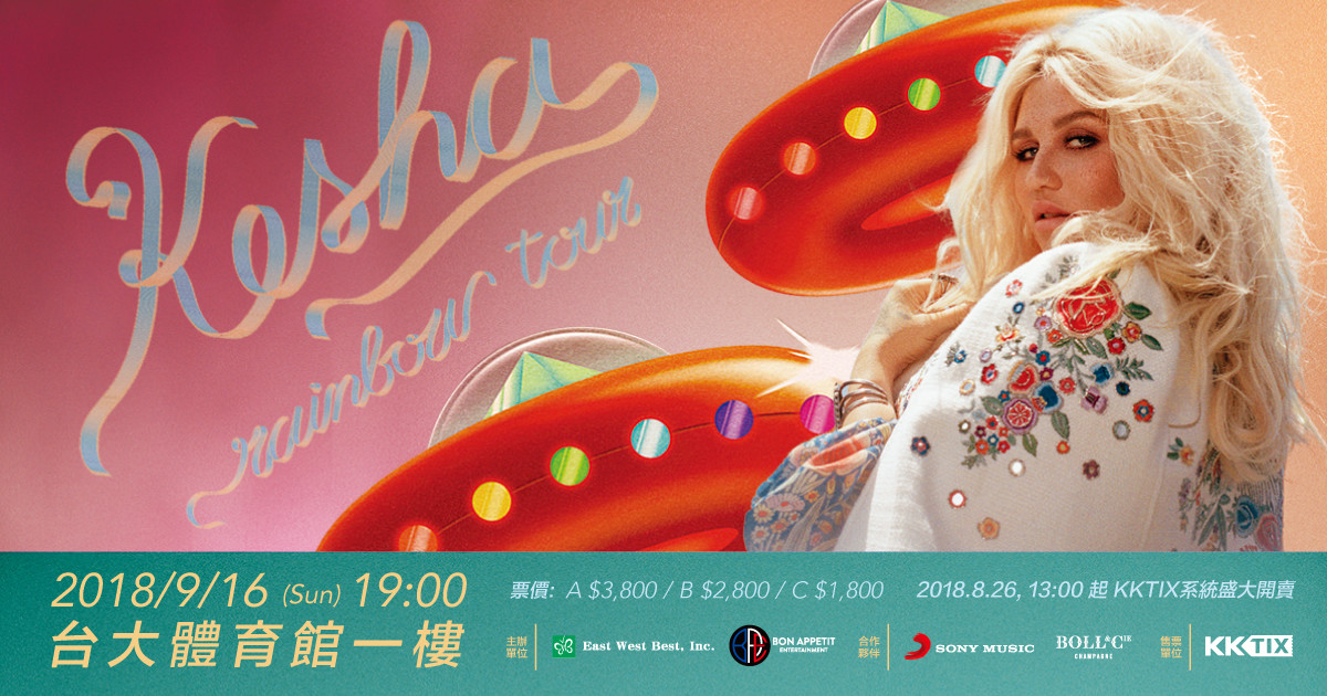 而台灣粉絲在多年來的支持與等待下,終於迎來KESHA首次來台演出,本次RAINBOW TOUR 亞洲巡迴演唱會,作為亞巡的第二站,就讓我們和KESHA一起唱出首首動人曲目,一同留下難忘回憶!